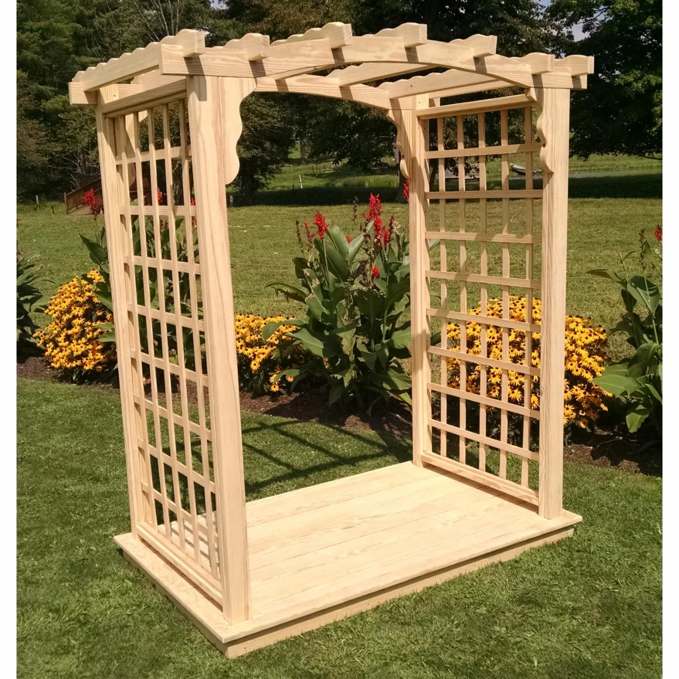 Add a romantic touch to your outdoor space with the A & L Furniture Cambridge 7 ft. High Cedar Arbor with Deck. This handcrafted Amish pergola is made from western red cedar, and each piece of wood is selected for its natural grain and strength. Relax on the deck of this classic square-lattice arbor, under an elegant, scalloped-arch top. Ideal for any garden or yard. Available in your choice of finish. For ground support this item includes (4) Hurricane Anchor Stakes.