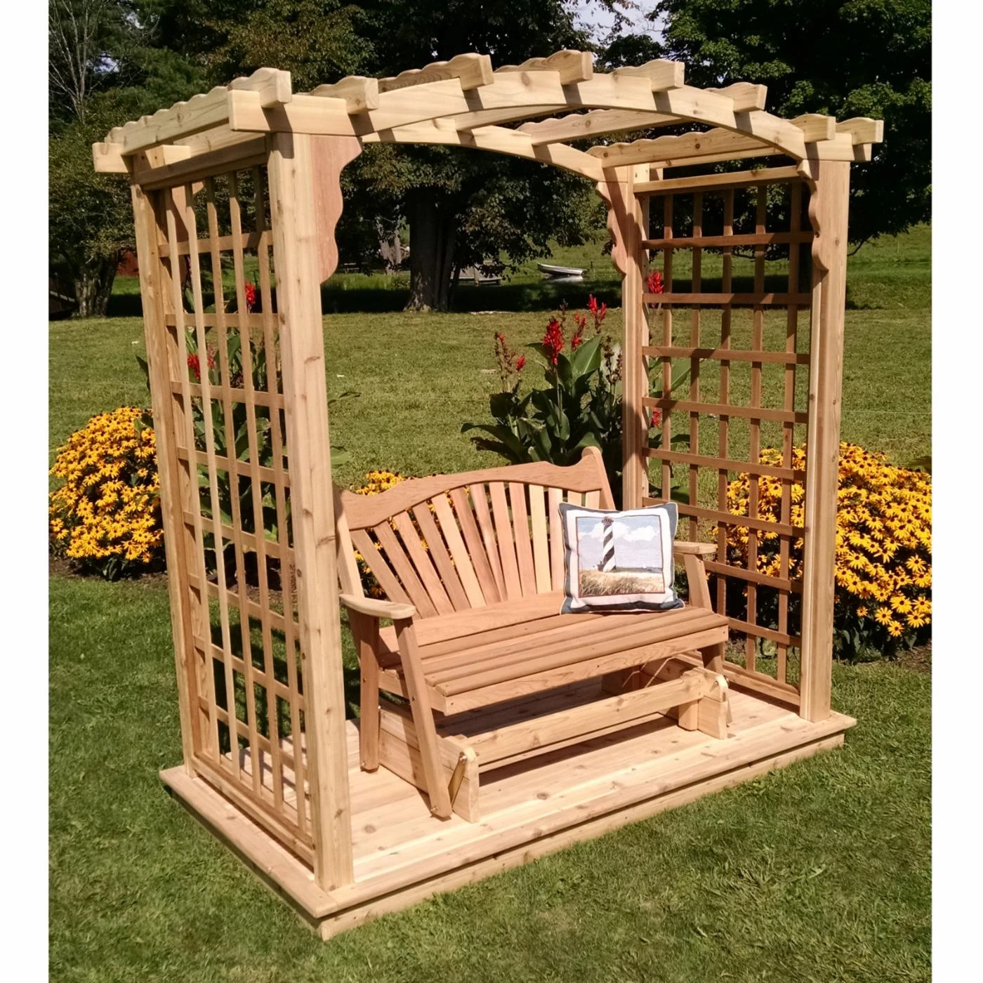While away perfect summer days enjoying your A & L Furniture Cambridge 7 ft. High Cedar Arbor with Glider. This classic, wide-frame square-lattice pergola is constructed of western red cedar, and each piece of wood is selected for its natural grain and strength. Relax on the easy glider in this elegant, scalloped-arch arbor – the perfect spot to read a book or enjoy an iced tea in any garden or yard. The hand-crafted Amish arbor is available in your choice of finish.