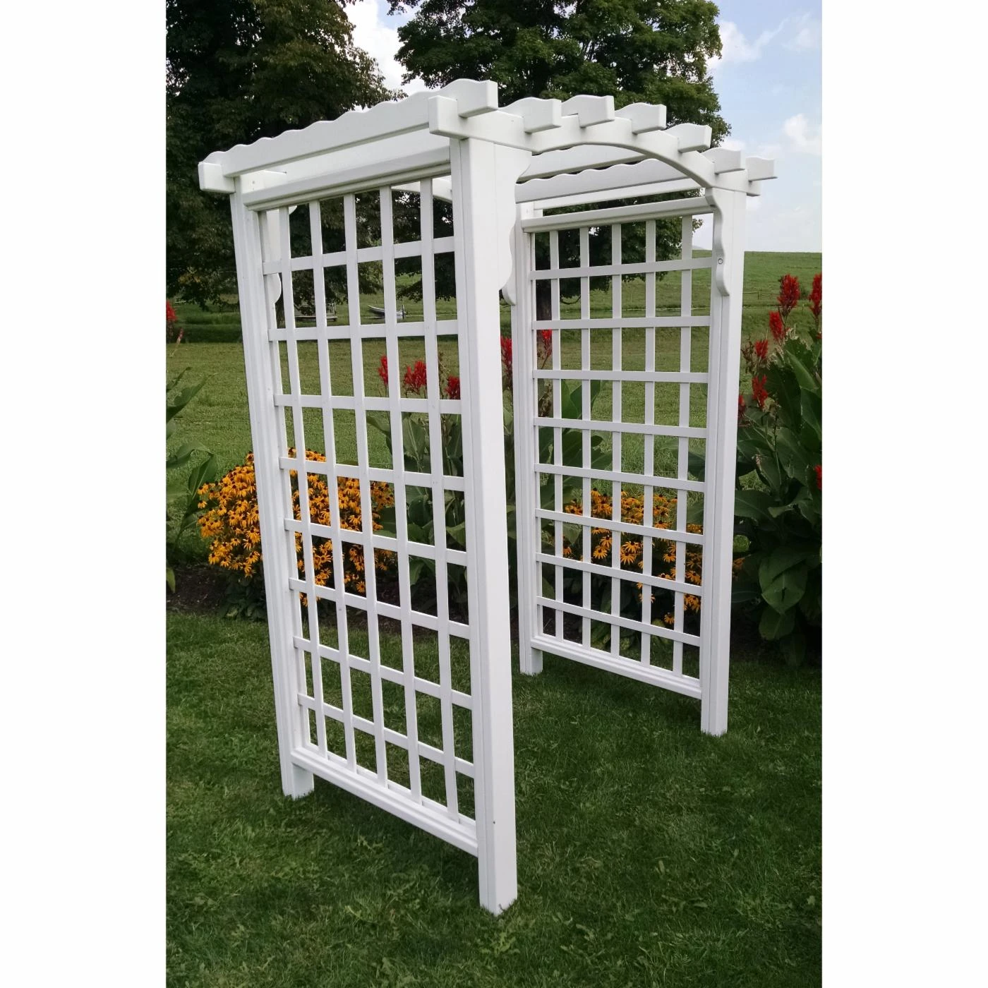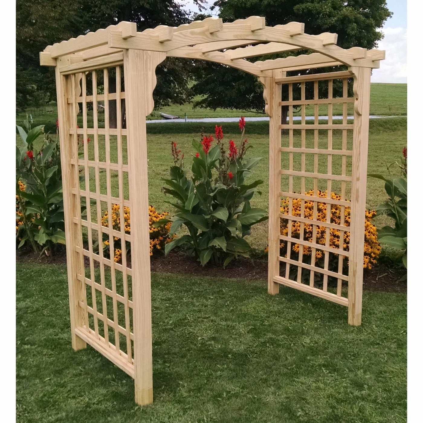 Make your garden the perfect spot for a stroll with the A & L Furniture Cambridge 7 ft. High Cedar Arbor. This wide-set, classic square-lattice arbor, available in your choice of finishes, is ideal for any courtyard or outdoor space, and its softly arched top and scalloped detailing add an extra touch of elegance. This handcrafted Amish pergola is made from western red cedar, and each piece of wood is selected for its natural grain and strength. Add some climbing roses for a bright, floral flourish. For ground support this item includes (4) Hurricane Anchor Stakes.