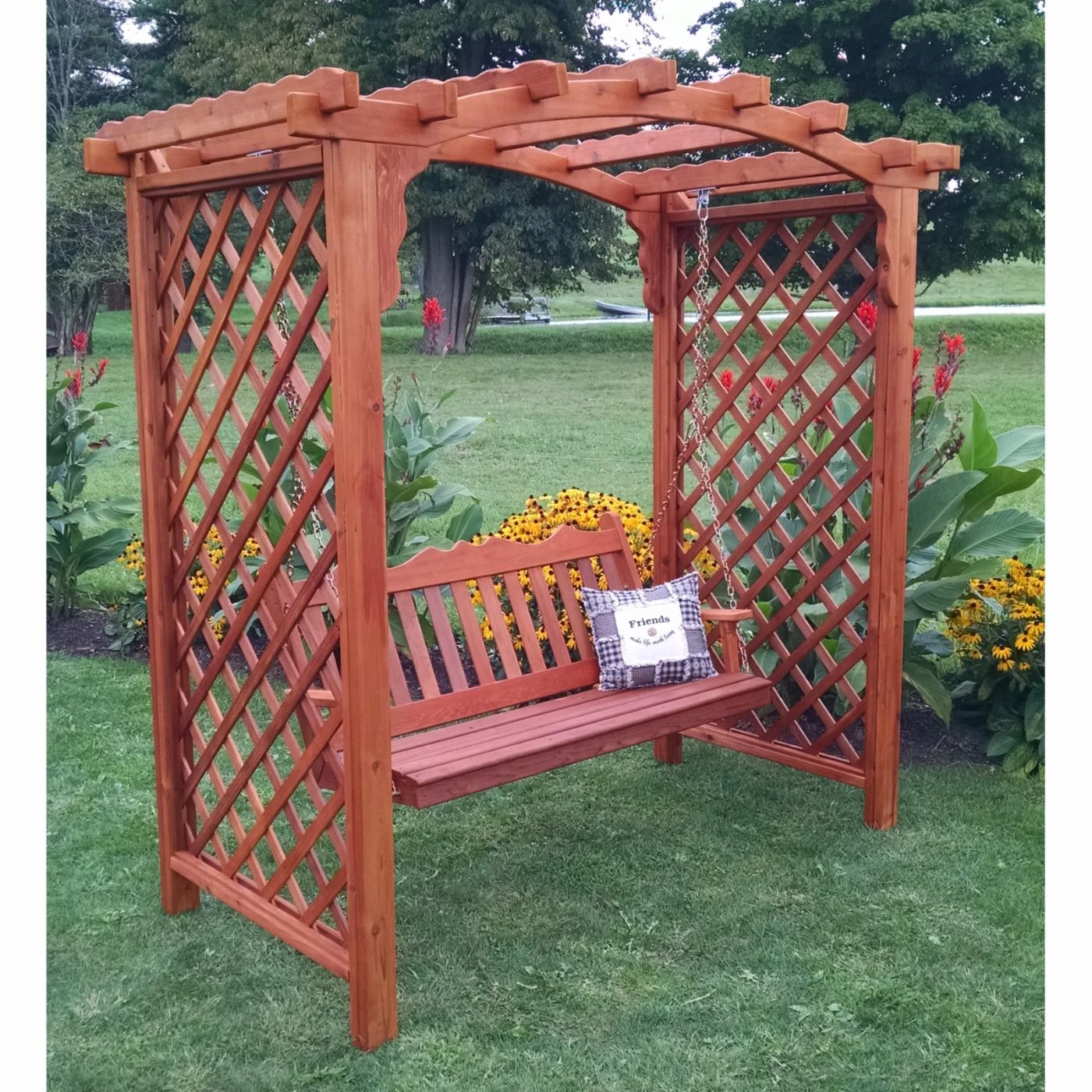While away perfect summer days enjoying your A & L Furniture Jamesport 7.3 ft. High Wood Arbor with Swing. This classic, wide-frame diamond-lattice pergola is constructed of treated yellow pinewood selected specifically for its durability and beauty. The elegant, scalloped-top arbor is the perfect spot to sit under the archway and read a book or enjoy an iced tea in any garden or yard. This hand-crafted Amish arbor is available in your choice of finish. For ground support this item includes (4) Hurricane Anchor Stakes.