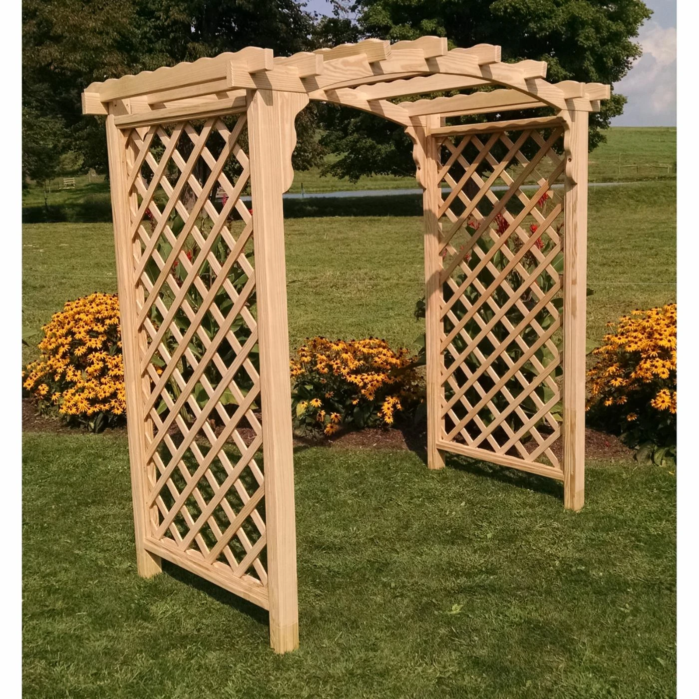 Add a romantic touch to your outdoor space with the A & L Furniture Jamesport 7.3 ft. High Wood Arbor. This large-frame, diamond-lattice pergola has an extra touch of elegance with a scalloped archway top, perfect for any garden or yard. The pressure-treated pine is selected especially for its durability, so no matter which of the finishes you select, this hand-crafted classic will last for years to come. For ground support this item includes (4) Hurricane Anchor Stakes.