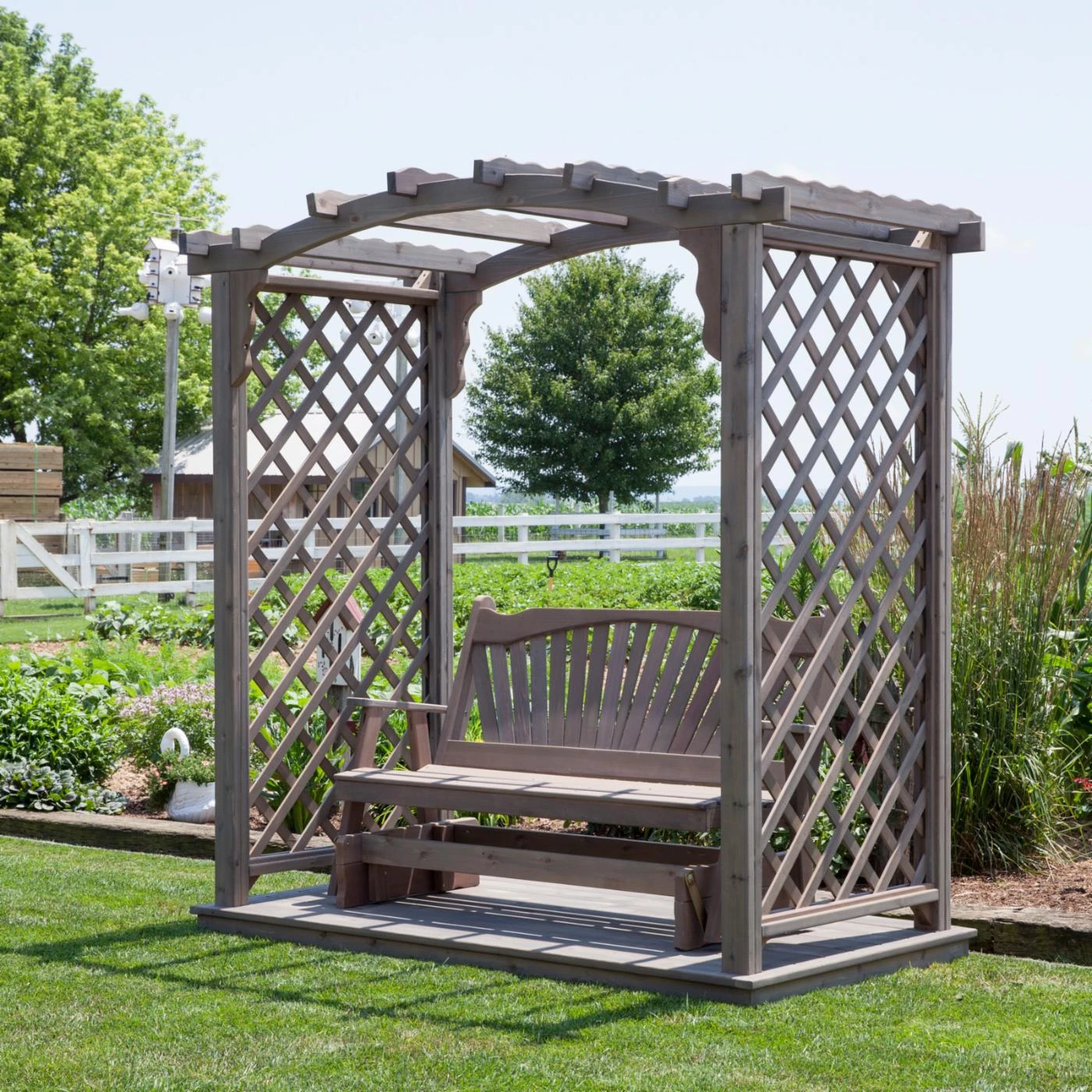While away perfect summer days enjoying your A & L Furniture Jamesport 7 ft. High Cedar Arbor with Glider. This classic, wide-frame diamond-lattice pergola is constructed of western red cedar, and each piece of wood is selected for its natural grain and strength. Relax on the easy glider in this elegant, scalloped-arch arbor – the perfect spot to read a book or enjoy an iced tea in any garden or yard. The hand-crafted Amish arbor is available in your choice of finish. For ground support this item includes (4) Hurricane Anchor Stakes.