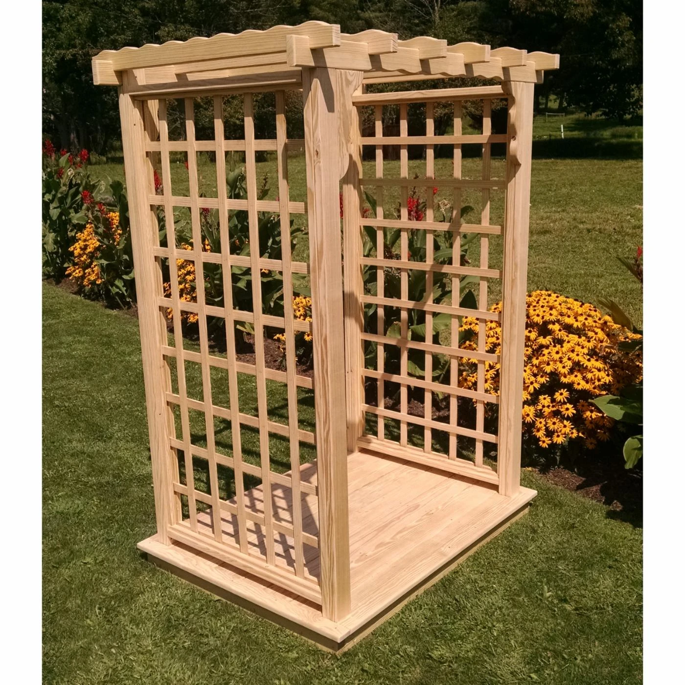 Add a romantic touch to your outdoor space with the A & L Furniture Lexington 7.5 ft. High Cedar Arbor with Deck. This handcrafted Amish pergola is made from western red cedar, and each piece of wood is selected for its natural grain and strength. Relax on the deck of this classic square-lattice arbor, under an elegant, scalloped top. Ideal for any garden or yard. Available in your choice of finish. For ground support this item includes (4) Hurricane Anchor Stakes.