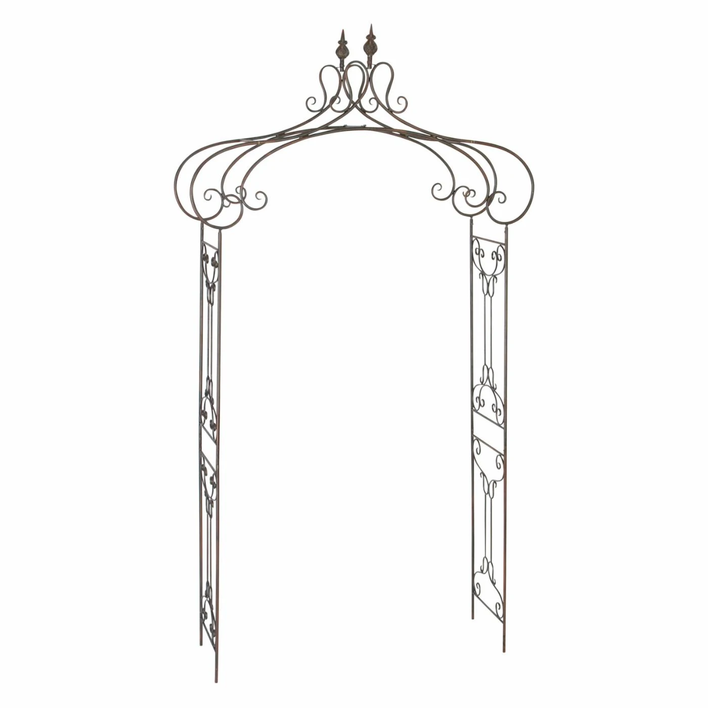 Iron scrolls form a gracefully curving canopy for the DecMode 7.92 ft. Iron Arch Arbor. Twin finials on arched supports reach for the sky. Detailed side panels are lovely in their own right or as trellises for climbing plants.