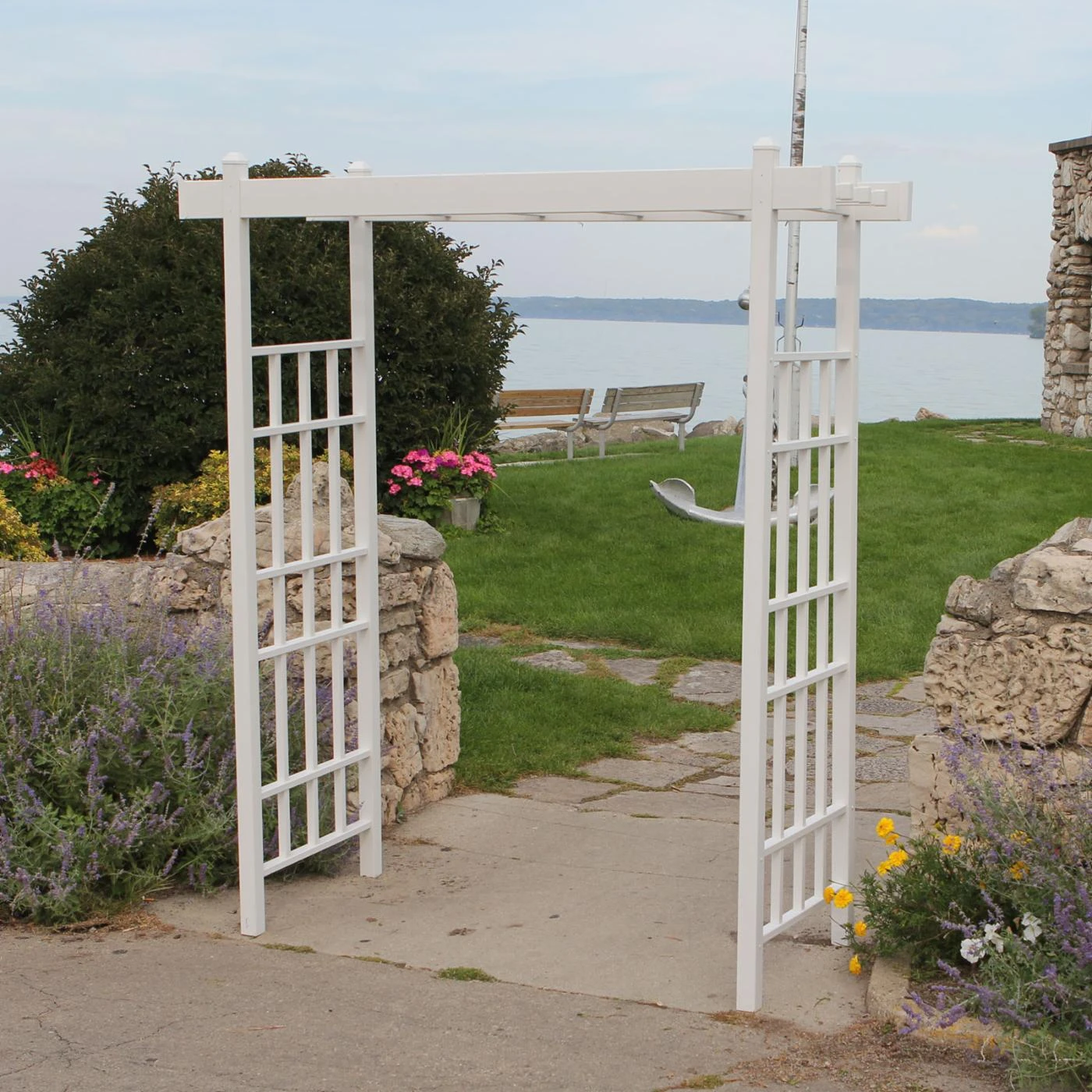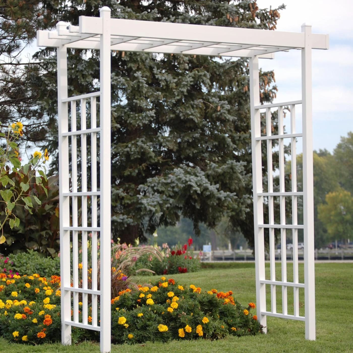 With this Dura-Trel Bakersfield Arbor at the entrance to your garden, guests will be welcomed in style. This arbor features a classic design and is made of bright white, weather-resistant, and maintenance-free vinyl. The sides and top of this arbor boast grid frameworks that encourage climbing vines and flowers to flourish. This arbor has pre-drilled holes for easy assembly and includes ground anchors. A 20-year limited manufacturer’s warranty ensures lasting beauty.