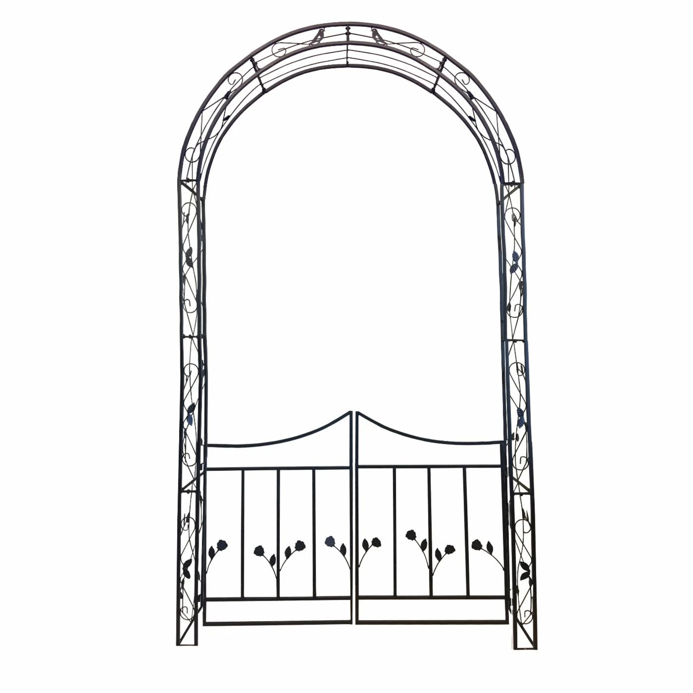 Mark off the entrance to your yard’s secret garden getaway with the Tierra Garden Rosetta Garden Arch with Gate. Plant flowers and curling vines nearby so they can climb up the arch’s sides so the blooms can add dimension and color. The arch comes with four ground anchors and four patio anchors included, so you can set this up on a patio or other solid surface, or stake it into the earth. The square steel tubing of the frame is protected by a double layer of black powder coating in order to better withstand the elements. Assembly is required.