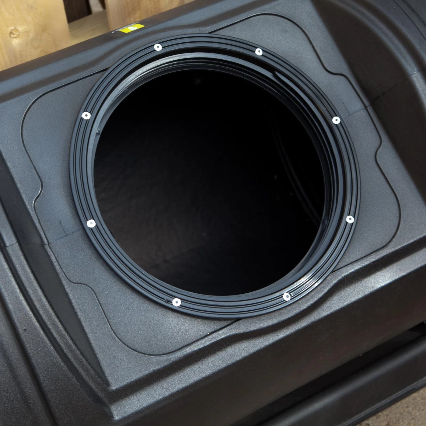 This innovative compost bin is made of molded recycled polyethylene plastic and holds up to 7 cubic feet of material. The black color of the bin absorbs heat, which facilitates faster composting. The low-to-the-ground design and wide, twist-on lid allows you to load and unload material easily. The air vents circulate air within the batch to accelerate rapid composting. The rotating drum can be removed from its base and rolled to any location for filling or dispensing. The compost tumbler arrives fully assembled and is backed by a one-year manufacturing defect warranty.