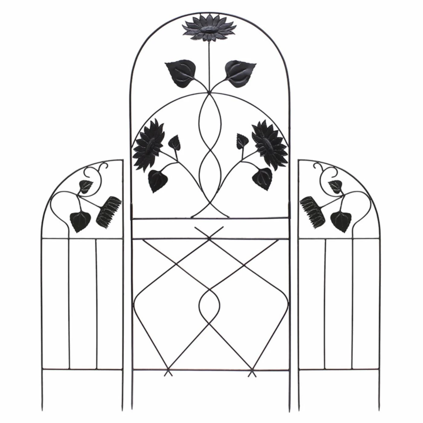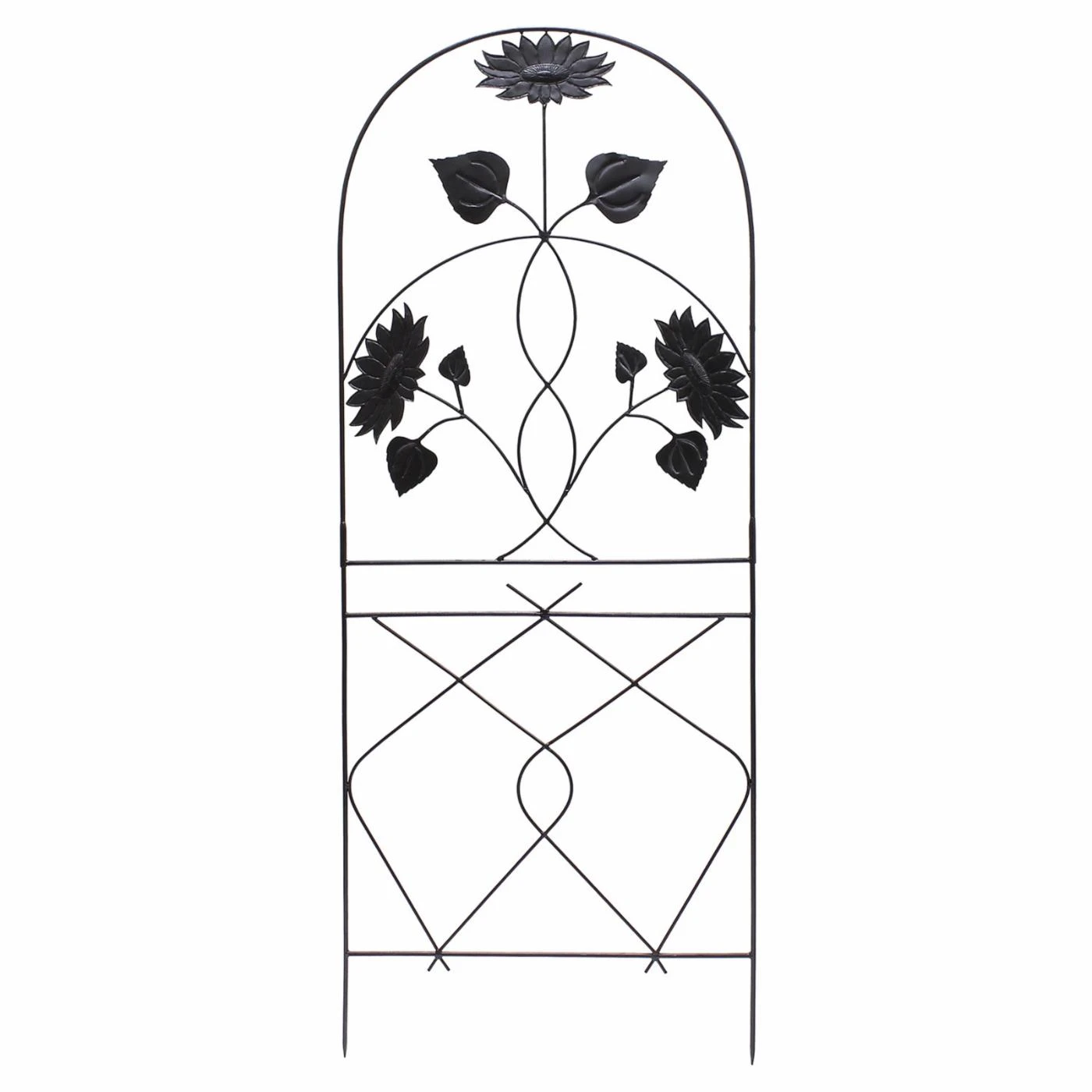 Vines, climbing flowers, or even vegetables transform this Achla Designs Sunflower Garden Trellis into a natural privacy screen. This freestanding garden trellis is handmade of wrought iron with an arched top, sunflower detail, and powder-coat black finish. It stakes into the ground and may be used in conjunction with other trellis panels.