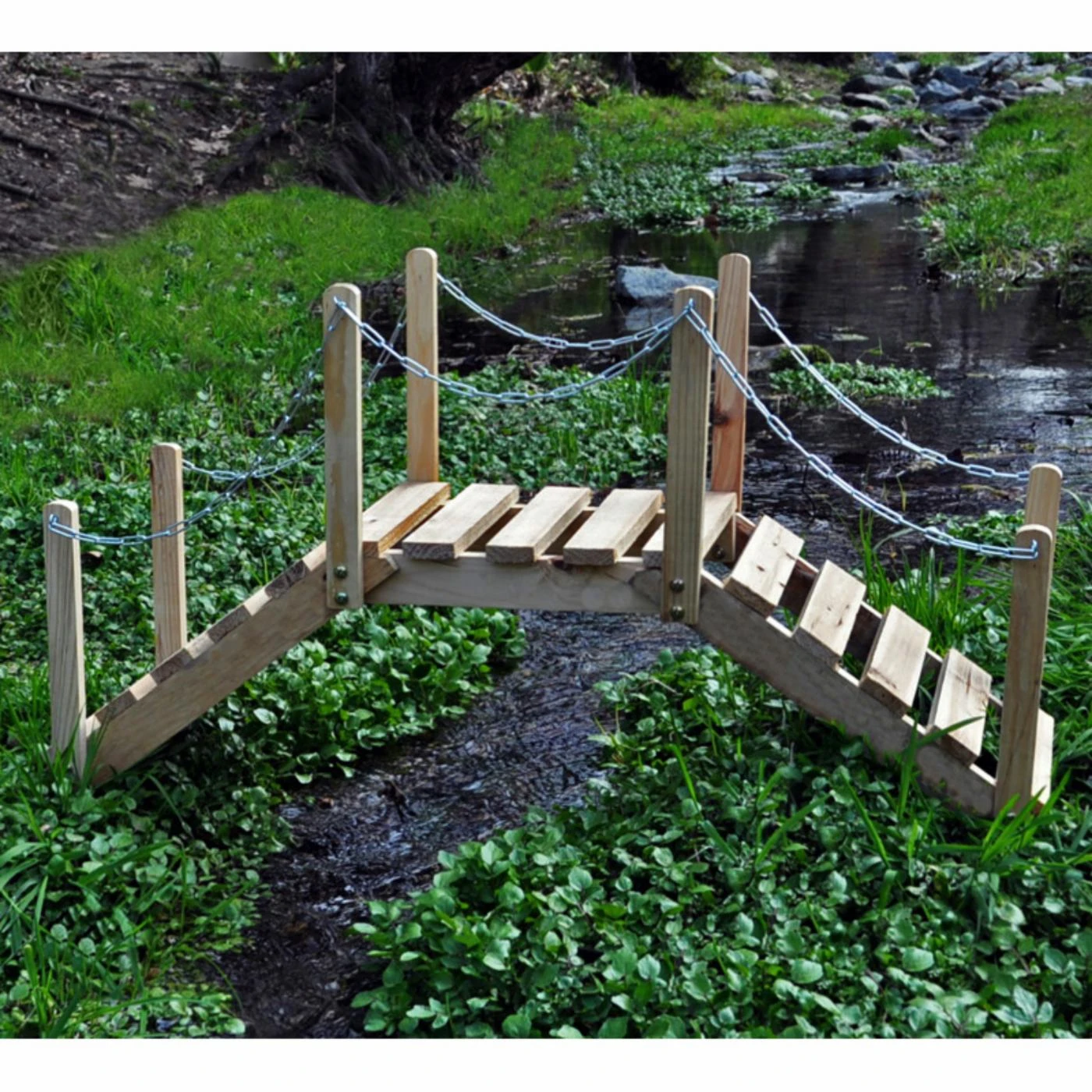 The Decorative Garden Bridge – Natural accents your garden pathway or backyard water display with unique, country style. This charming little footbridge is built from solid cedar a features a wide slatted design that pairs well with Adirondack-style lawn furniture. The piece comes unfinished to emphasize the natural beauty of the wood; cedar is naturally-resistant to insect decay and moisture, or you can paint or stain the piece any way you wish. Piece is decorative only and not intended for use. Rust resistant galvanized steel screws and hardware are included. Piece requires some assembly.